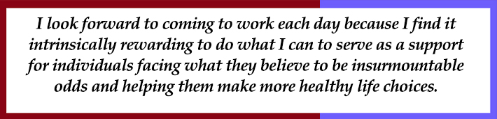 I am motivated each and every day by the prospect of making some positive impact in the lives of individuals while they are separated from their loved ones, normal lives, and coping skills. People are often surprised by how much I enjoy working in a correctional facility. I look forward to coming to work each day because I find it intrinsically rewarding to do what I can to serve as a support for individuals facing what they believe to be insurmountable odds and helping them make more healthy life choices.